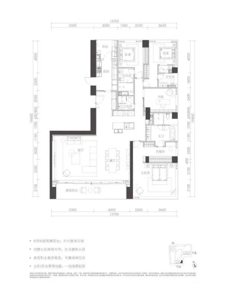 整个项目的楼王单位,只存在于高区33-38楼,极为稀缺。户型格局相当于T1a栋A户型的加强版,楼层更高,尺度更大,功能性更全面;增加了保姆间、起居室等空间,近80㎡的至尊主卧配备独立书房;起居室估计得开灯。