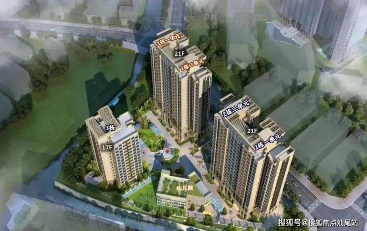 项目由3栋住宅和一所幼儿园组成,总户数456,车位396个
