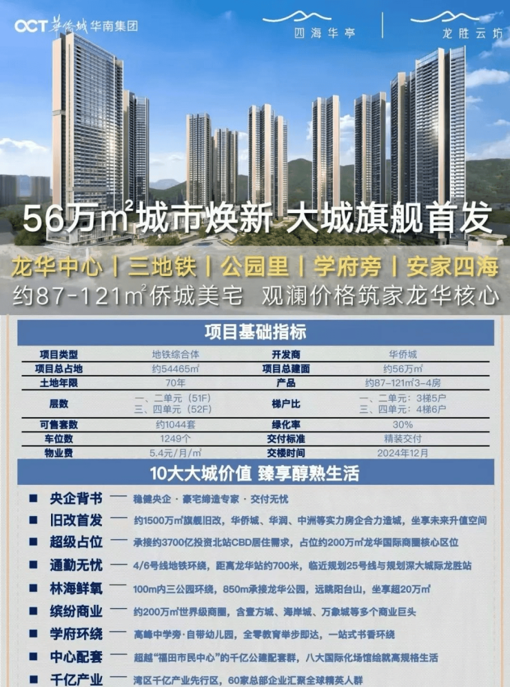 华侨城四海华亭是华侨城集团在深圳龙华区大浪街道开发的大型城市更新项目,前身为“龙胜村旧改单元”,总占地面积约5.45万㎡,总建筑面积约56万㎡,涵盖住宅、公寓、商业、教育等复合业态,定位为“生态大城综合体”。