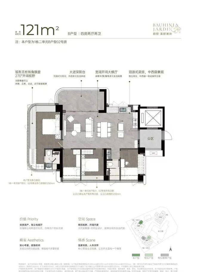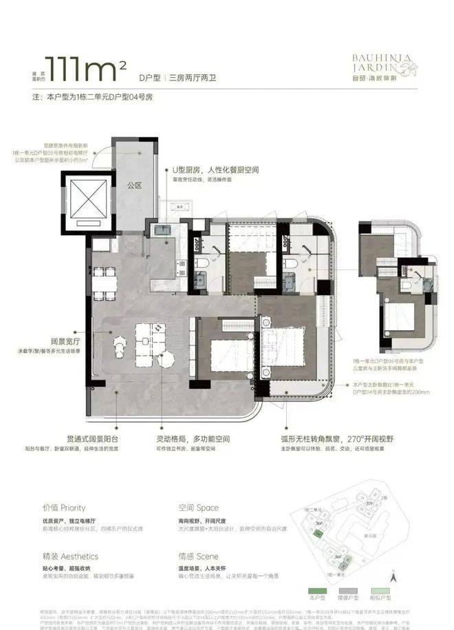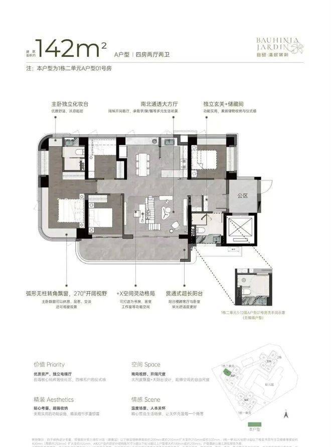 主推约96㎡稀缺三房、111㎡3+1房、122㎡四房、142㎡四房。户型设计了大客厅、宽景阳台、阔景飘窗等,拥有山海河多重景观资源,计划品质精装交付。户型采用建筑新规设计,户户大阳台,4梯5户,分布式电梯设计,独立电梯厅。