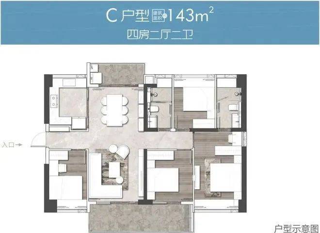 户型方正实用,109-143㎡的3-4房设计,户户双阳台,层高3.15米,居住舒适度高。