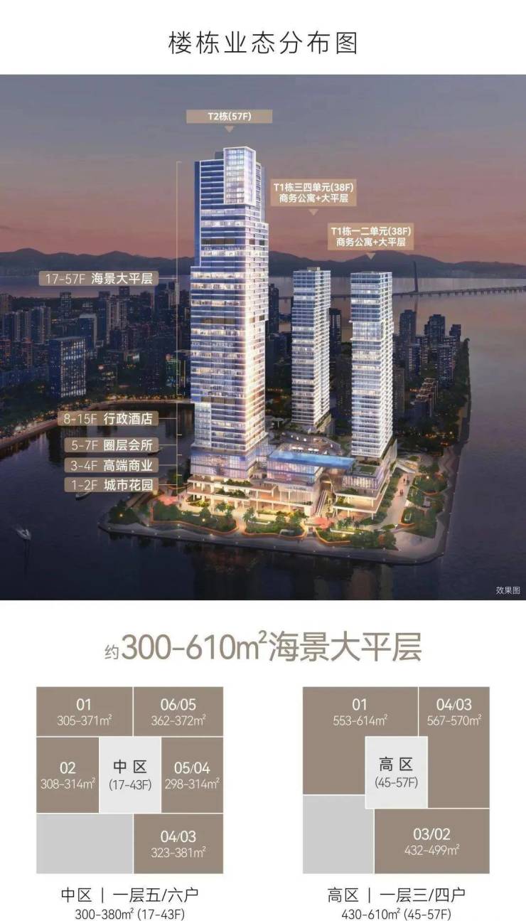 内部配套:配备高端私密会所、约 766 平方米的深圳首个悬空无边际海景泳池、首层城市花园、健身房、儿童游乐区以及 1800 平方米的海洋博物馆等设施。