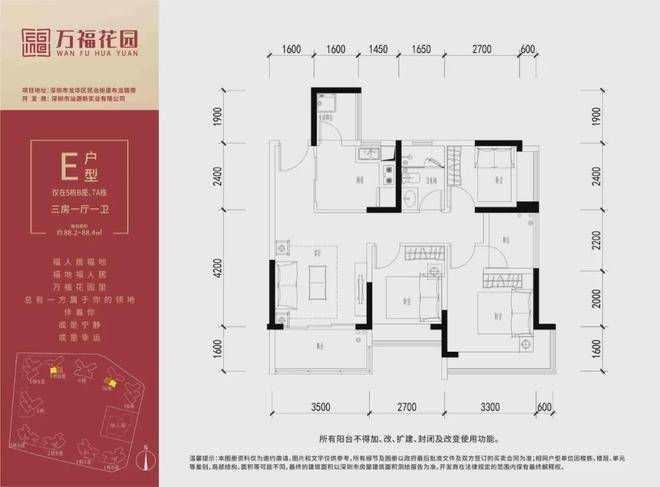 万福花园,总占地面积约3.5万㎡,总建筑面积约22万㎡,计容建筑面积15.7万㎡,容积率4.32,绿化率40%,共由7栋10座总高32-33层的住宅组成。其中1/2/6/7栋住宅33F,3/5栋住宅32F,另外规划有1所幼儿园,打造有1.8万㎡园林,超大楼间距花园空间。