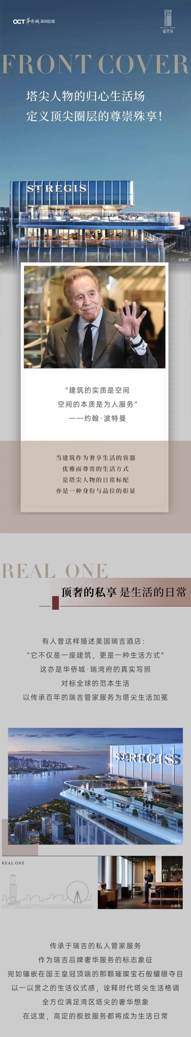华侨城瑞湾府,是一栋集“酒店+商业+办公”于一体的都市综合体,高区是百年奢华瑞吉酒店,中区则打造为建面约190㎡-360㎡珍藏大平层——瑞湾府,底部配有高端商业——瑞湾荟。华侨城瑞湾府总占地面积约7700㎡,计容建筑面积为约10.7万㎡,是集4万㎡百年奢华品牌瑞吉酒店、2.8万㎡企业会馆、3.4万超甲级办公和5000㎡精品商业于一体的超高层城市综合体。建筑高度230米,是前海湾北侧天际线的制高点。项目建成后,将成为华侨城集团巅峰筑造的独栋超高层新型综合体,引领粤港澳大湾区都市商务新地标、社会主义先行示范区文旅生活新风向。