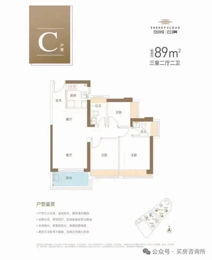 户型方正,动静分区明显,客厅外就是阳台,便于采光通风、观景。