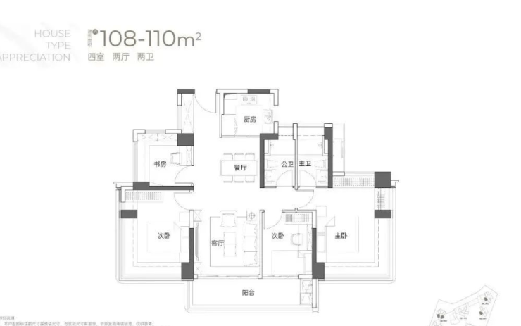 108-110㎡的4房2厅2卫:竖厅双龙抱珠格局,客厅开间3.5米,LDKB一体化,4个卧室分别做到了3.7米/3.4米/2.8米/2.6米的宽度,主卧加2个次卧270°全景飘窗,客厅连接次卧出6.1米长的大阳台,U型厨房,得房率约95-97%(包含赠送),西南或东南朝向。户型分布在1栋1/2/3单元03/04户型,03户型东南朝向,04户型西南朝向;只有2栋2/3单元看小区,其他都看向小区外部;