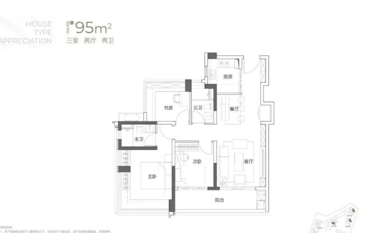 95㎡的3房2厅2卫:传统竖厅格局,客厅开间3.5米,LDKB一体化,S墙设计预留冰箱卡槽位,3个卧室分别做到了3.6米/2.8米/2.8米的宽度,主卧加1个次卧270°全景飘窗,客厅连接次卧出6.3米长的大阳台,U型厨房,得房率约95-97%(包含赠送),西南或东北朝向。户型分布在2栋2/3单元04/05户型,东北朝向看大南山、2栋1单元04/05户型西南朝向看小区;