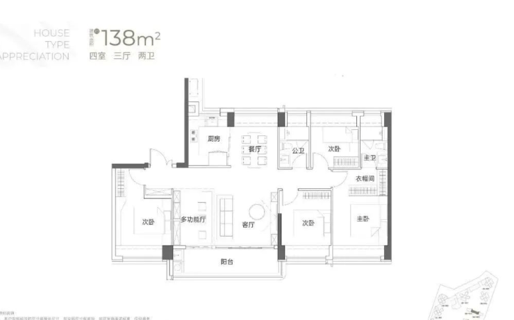138㎡的4房2厅2卫:竖厅南北通透格局,专梯入户,客厅6.1米开间,LDKB一体化,全屋飘窗,4个卧室分别做到了3.9米/3.25米/2.9米/2.8米的宽度,主卧加1个次卧270°全景飘窗,客厅出6.1米长的大阳台,U型厨房,得房率约95-97%(包含赠送),阳台主朝西南向。138平米户型分布在3栋1单元、3栋2单元、4栋1单元、4栋2单,4个单元纯大户型。