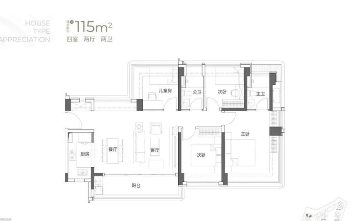115㎡的4房2厅2卫:横厅南北通透格局,客餐厅6米开间,LDKB一体化,全屋飘窗,4个卧室分别做到了3.9米/3米/2.8米/2.6米的宽度,主卧加1个次卧270°全景飘窗,客厅出6米长的大阳台,L型厨房,得房率约95-97%(包含赠送),西南或东南朝向。115平米户型分布在1栋1单元、1栋2单元、1栋3单元01/02户型,01户型西南朝向都是看小区外围,02户型看向小区;