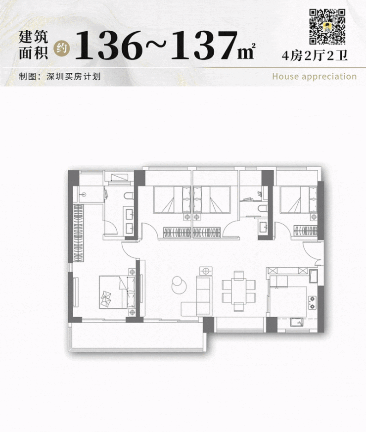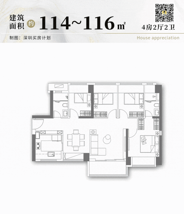 四房设计,满足多孩/三代同堂,乃至电竞房/书房等需求,使用灵活。