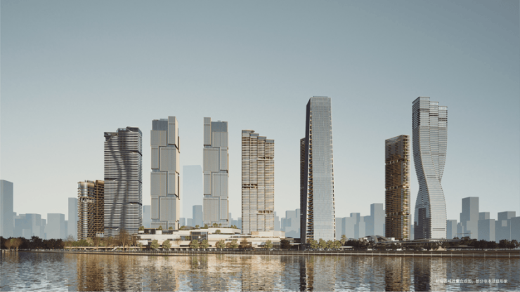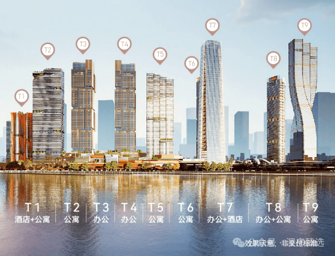 T3和T4是约280米的双子塔超甲级写字楼,幕墙装饰高度291米;T5栋为甲级写字楼,高约250米;T7是超甲级办公楼,约250米;T9为公寓楼,300米。
