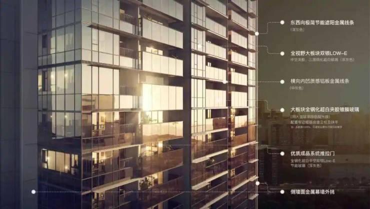 项目携手CCD、华汇、迈丘三大师匠筑粤海之上,逾50万㎡的地标级奢居综合体,与周边超甲A级写字楼群和谐融合,采用类公建化手法,在建筑外立面上打造流云之幕幕墙集成系统,配置大尺度双银Low-E三层钢化超白玻璃,不仅精准阻隔城市喧嚣,还能起到节能效果,高透光率使室内空间更为通透。同时也让外立面呈现轻奢质感,历久弥新。