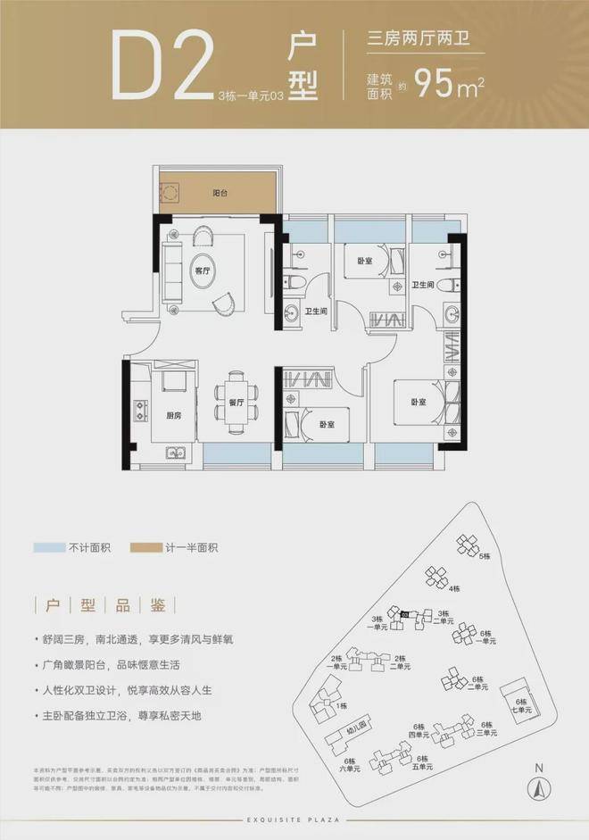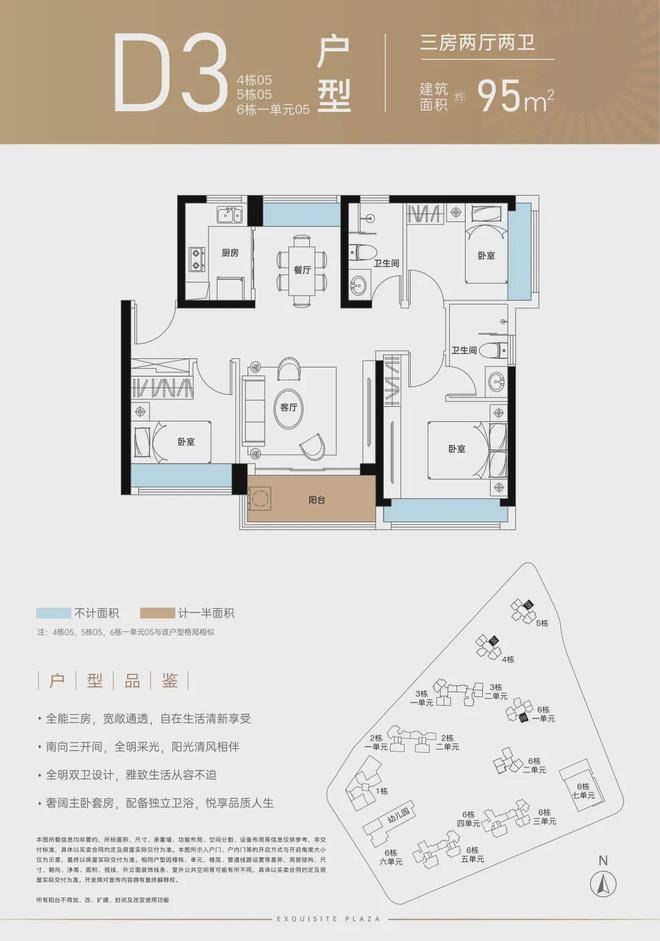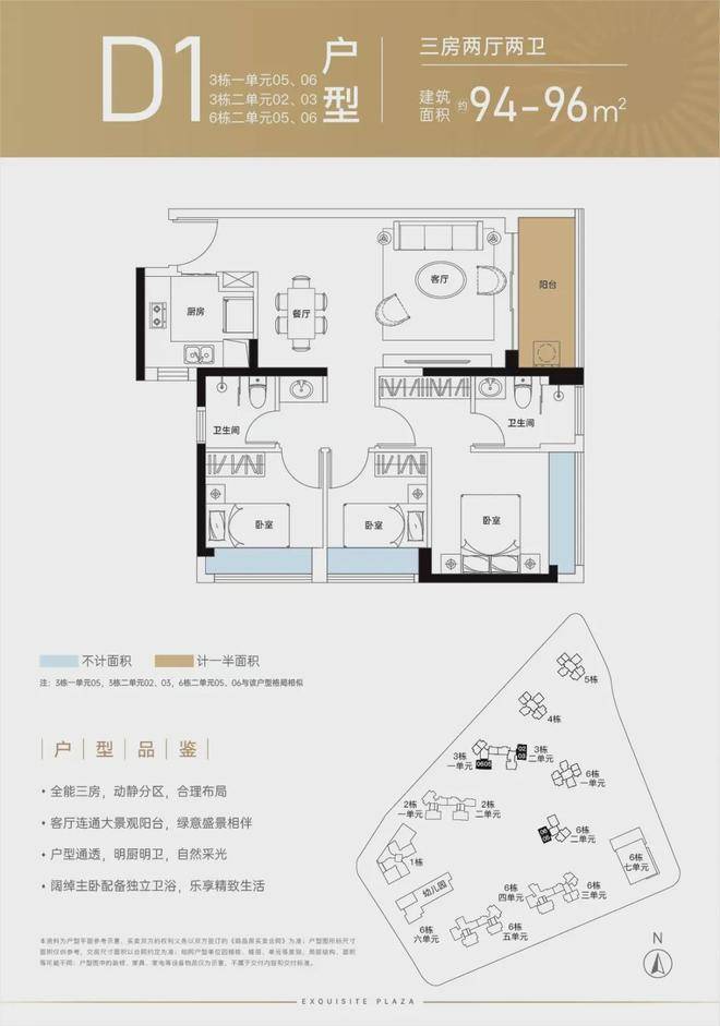 94㎡的3房2厅2卫(D1),设计的是竖厅格局,客餐厅一体化,客厅3.7米开间,L型厨房,公卫三段式分离设计,得房率:73.33%(不含赠送),西南、正南向或朝东向看小区园林