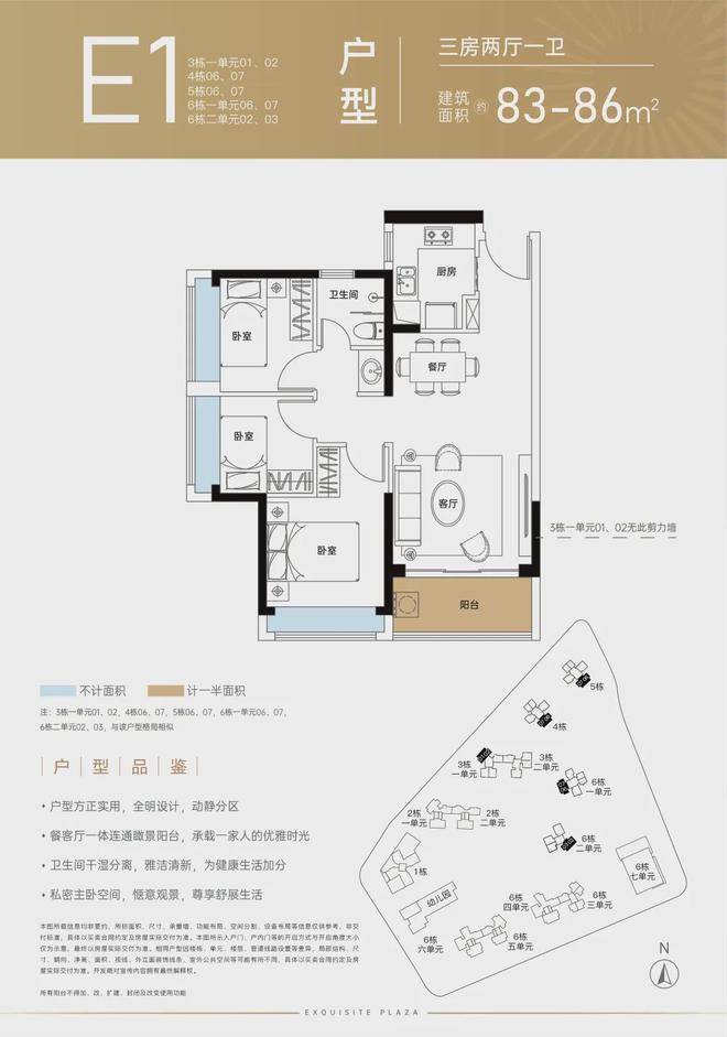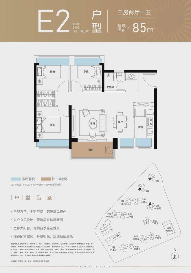 85㎡的3房2厅1卫(E2),设计的是横厅南北通透格局,客厅3.5米开间,L型厨房,卫生间三段式分离设计,得房率:72.95%(不含赠送),阳台主朝东南或西南向看小区园林
