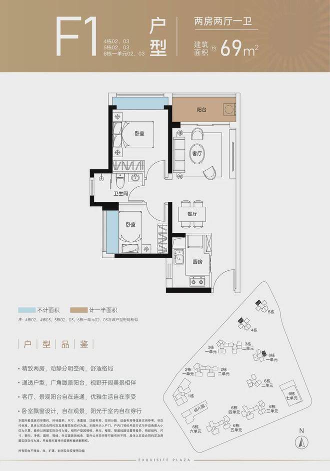 69㎡的2房2厅1卫,设计的是竖厅格局,客餐厅一体化,客厅3.3米开间,L型厨房,得房率:72.94%(不含赠送),西北向看坪山河景观或东北朝向面向锦龙大道