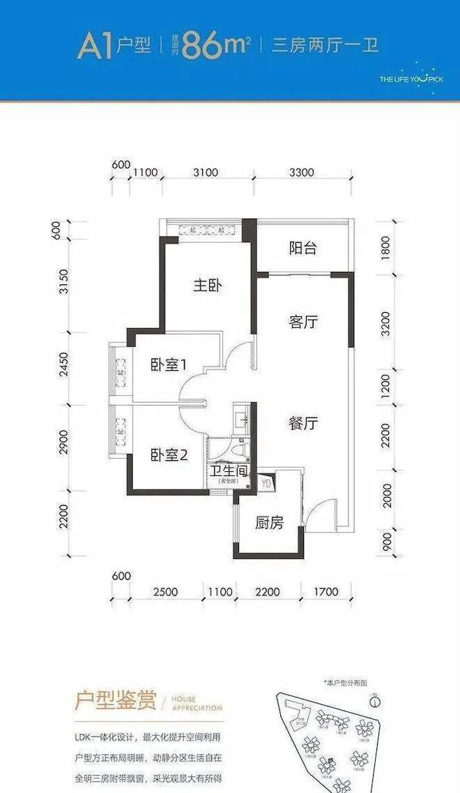 约86㎡三房一卫,竖厅,动静分区结构,整体比较传统,功能间偏紧凑了一些,实用性还是不错的,B座和E座的两个户型结构及功能间布局是一样的,E座的玄关和厨房面积稍大一点,其它一致。