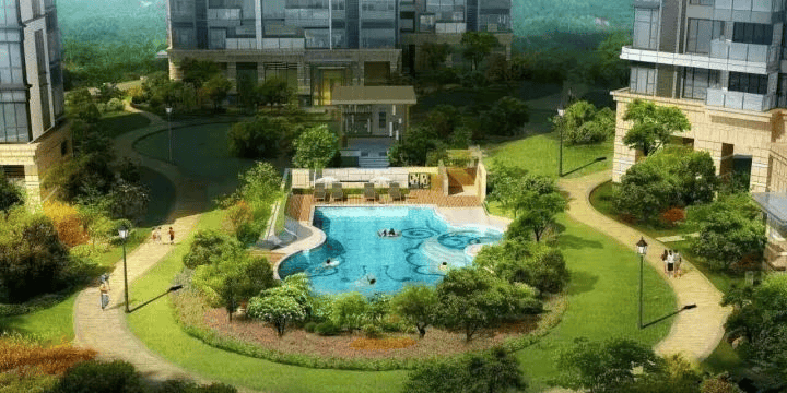 奥雅设计: 精艺雕琢新亚洲风格园林,多重台地,叠水园林,一步一景。更首创小提琴形状泳池中心泳池。在群山环绕间,置身梦幻泳池,生活也不过如此;