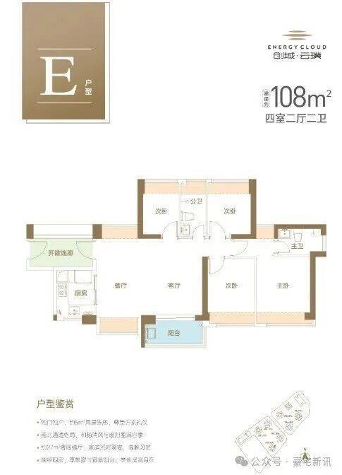 108m²的4房2厅2卫,仅2栋4单元03户型才有,进门赠送5.34m²的入户玄关,设计的是横厅南北通透格局,客餐厅5.9米开间,全屋8面飘窗,分别做到了主卧13.73m²/次卧9.53m²/次卧7.47m²/次卧5.75m²(包含墙体飘窗),U型厨房,卫生间干湿分离,得房率74.4%(不加赠送),套内面积80.32m²,阳台东南朝向。