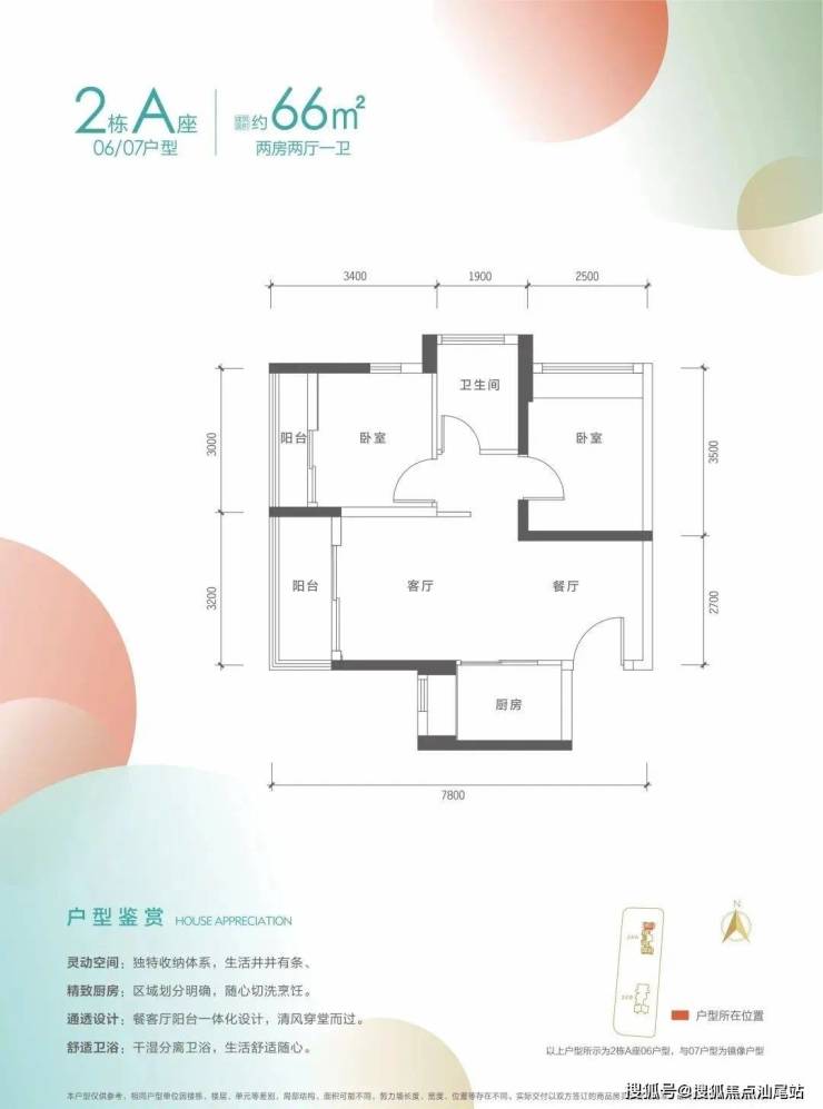 2栋A座06.07户型,设计的是竖厅格局,客厅3.2米开间,2个卧室分别做到了主卧9.9㎡/次卧9.1㎡(包含墙体飘窗),得房率约74.05%(不含赠送),朝西或朝东向。