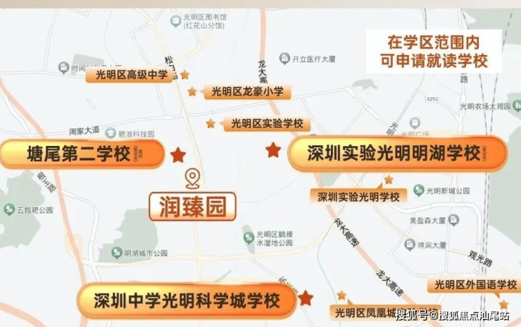 项目自带有1所9班制幼儿园,家门口约100米有1所九年制公办学校在建,另外根据光明区教育局2024年最新的学区划分,润臻园属于塘尾社区,小学学区划分在光明区外国语学校、凤凰城实验学校、光明区实验学校、玉塘学校、龙豪小学;初中学区划分在深圳中学光明科学城学校二部、光明高级中学、深圳实验光明学校。