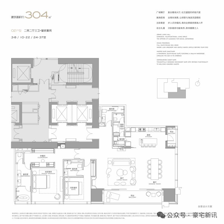 公寓主力户型为303㎡、326㎡、404㎡、572㎡等大平层,最大户型达1000㎡