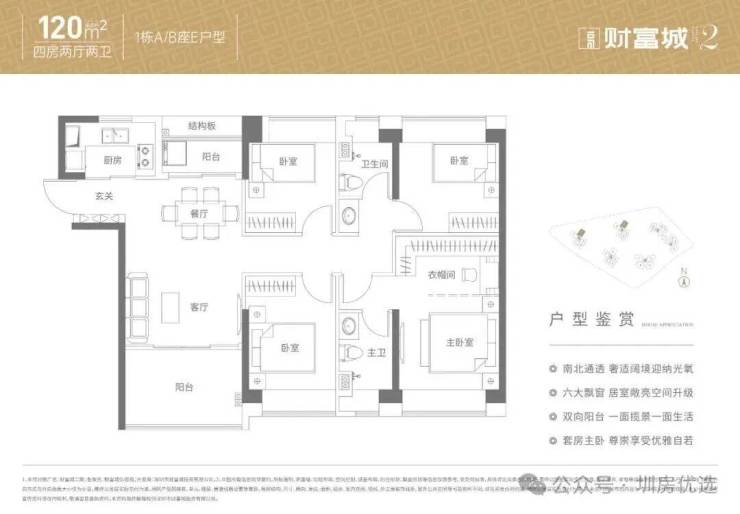 120㎡的4房2厅2卫,设计的是竖厅南北通透格局,双阳台设计,客厅实测3.5米开间,分别做到了主卧17.1㎡/次卧10.36㎡/次卧9.81㎡/次卧8.64㎡(实测面积,去掉墙体),U型厨房,得房率约:77.8%(不含赠送),阳台主朝西北向。赠送面积9.06㎡,加上赠送得房率85.29%。
