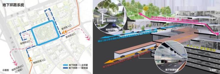 于外,不仅是 4 号线观澜站直连物业,观城还真金白银打造了与“前海地下路网”同级别的市级规划路网系统, 首创梅观高速直通小区,经由地下环道畅连各地块车库, 搭配整体「空中 + 地上 + 地下」的三重立体交通,实现业主的 高效出行 。