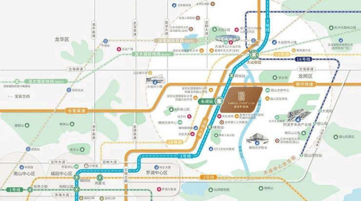 经纬。新世界188號与3号线永湖站0距离接驳,2 站速抵大运枢纽,可换乘14/16号线及深大城际快线;周边南坪快速、水官高速、东部过境高速等多线环伺,“三横五纵”多维路网于此铺陈,可速链东部全域,畅达深港主城核心。