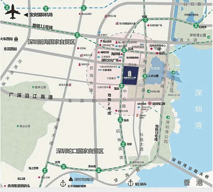 主干道:后海滨路、滨海大道、S3沿江,G4高速通达全城,约5min可至深圳湾口岸,约20min到达高铁福田站,约25min到达宝安国际机场