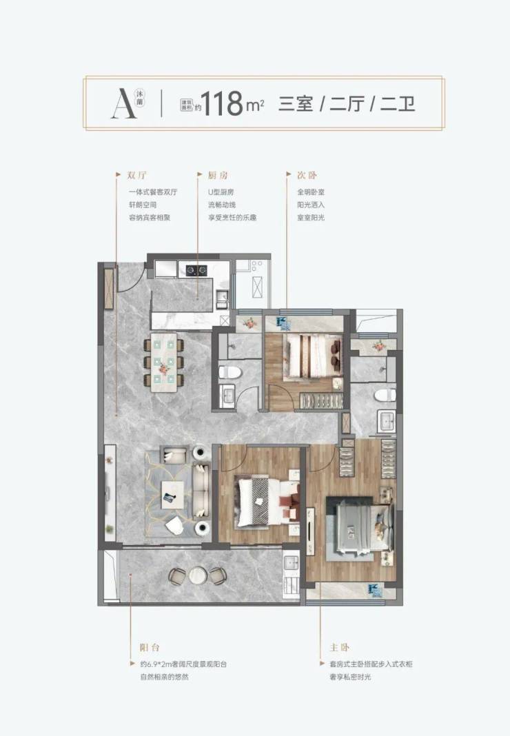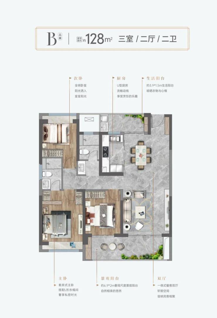 • 128㎡三房:6.9米景观阳台,南北通透,主卧套房+步入式衣帽间。