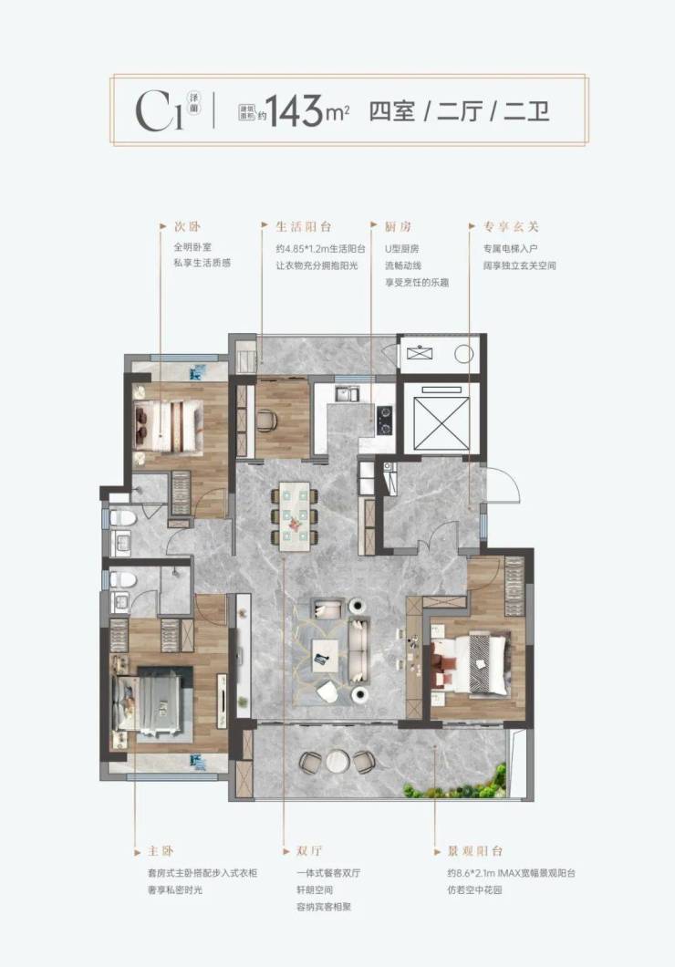 • 143㎡四房:专梯入户,5.6米IMAX客厅+8.6米巨幅阳台,三代同堂首选。