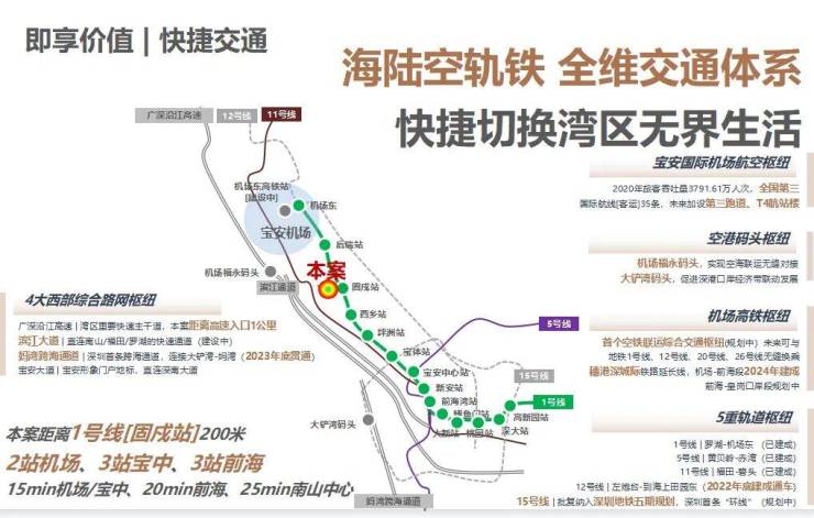 项目步行约200米就是1号线固戍站。(来源:百度地图测距)由此出发,约2站可达深圳机场、约4站可达宝安中心、6站可达前海核心区,还可快速通达机场福永码头、大铲湾码头。