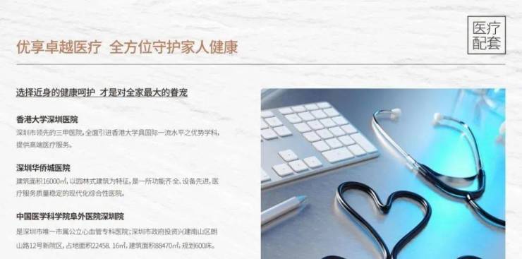 项目3公里范围内有5家医院:深圳沙河医院、华侨城医院、禾正医院、深圳市孙逸仙心血管医院等,最近的是医院是沙河医院,距项目450米,步行只需7分钟。