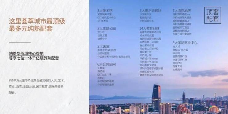 约6平方公里华侨城集合最顶级的人文、艺术、商业、酒店、主题公园、国际教育、娱乐等极致醇熟配套,中心繁华举步即达。