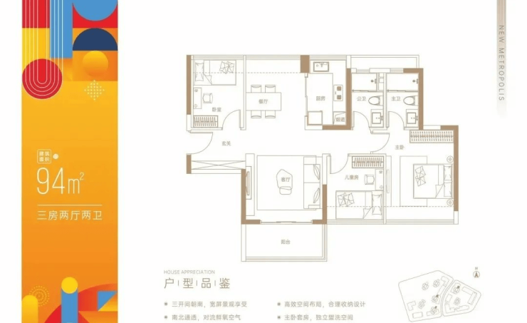 94平:3房2厅2卫,南北通透,使用率77.65%(不包赠送)