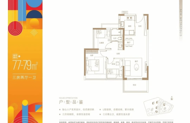 77-79平:3房2厅1卫,西北/西南/东南,使用率77.65%(不包赠送)