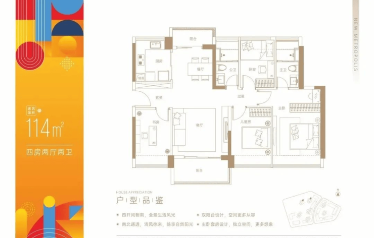 114平:4房2厅2卫,南北通透,使用率77.65%(不包赠送)