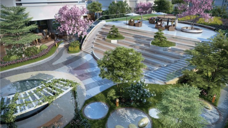 中央广场为国际大师原创,布局有环绕式立体互动绿化,包括花园跑道、主题架空层、文化园林等极具艺术范和人文气质的场景,又有别于常规市民广场方正、平整的开阔形态。