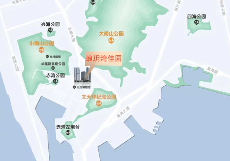 大、小南山以及赤湾山三山林立,城市绿肺环抱,轻松鲜活富氧呼吸;伶仃洋天然在侧,黄金海岸线前沿占位;约2公里范围内,有大南山公园、小南山公园、文天祥纪念公园、华英路景观公园、赤湾公园、兴海公园、月亮湾公园等公园环伺;另外项目周边遍布历史遗迹,有文天祥纪念公园、天后宫、赤湾烟墩、左炮台等,见证宋明清三个时代的历史印记。