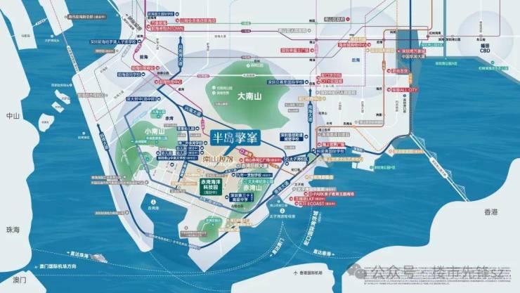 在大的蓝图下,中国南山以同步世界湾区的规划理念,打造“前港-中园-后城”的城市格局。并依托3山1海的资源禀赋优势,以“两环、三心、三轴、六大街区组团”的蓝图规划,打造屹立深圳湾区的世界半岛生活。