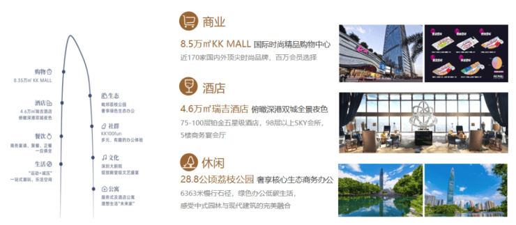京基100是深圳第二高楼、中国内地第五高楼、全球第十三高楼该建筑总建筑面积为60.24万平方米,建筑面积(地上部分)为23.3万平方米,其中办公17.6万平方米,酒店4.65万平方米,裙房商业约7万平方米,地下室12.53万平方米。大厦外形创意来源于喷泉和瀑布,为钢筋混凝土筒体加外部钢框架,由 A、B、C、D、E五栋塔楼组成,集甲级写字楼、超五星级豪华酒店、大型商业等为一体。A座超高层地上98层,地下4层,楼高441.8米。从上而下依次为顶部“蛋形”特色餐厅、六星级酒店和甲级办公。