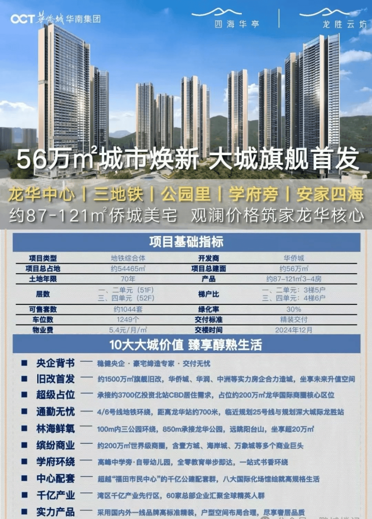 华侨城四海华亭是华侨城集团在深圳龙华区大浪街道开发的大型城市更新项目,前身为“龙胜村旧改单元”,总占地面积约5.45万㎡,总建筑面积约56万㎡,涵盖住宅、公寓、商业、教育等复合业态,定位为“生态大城综合体”。