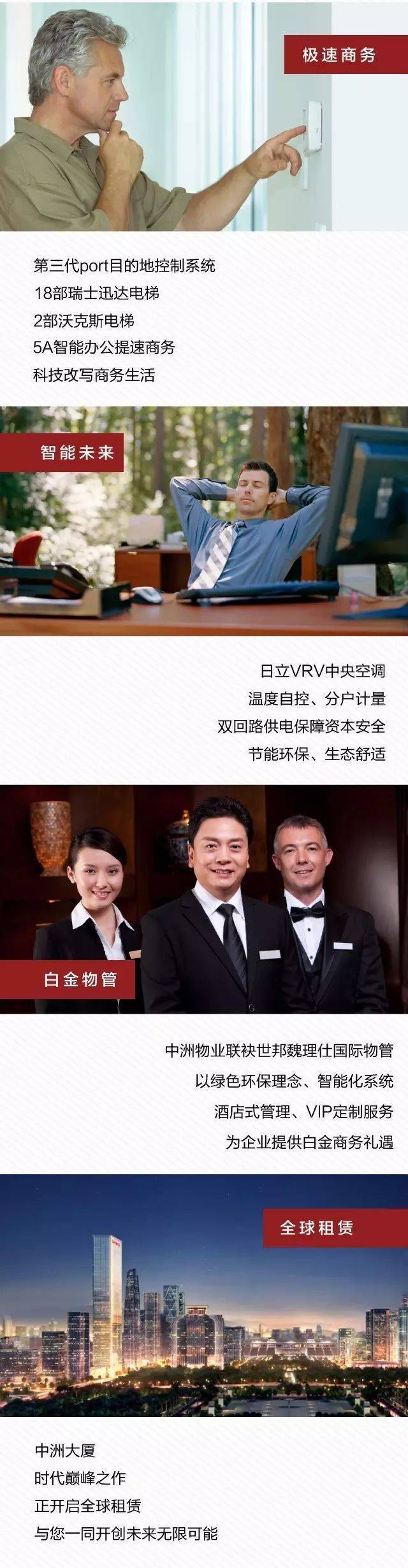 项目由中洲物业联袂世邦魏理仕国际物管,打造白金商务物管礼遇。以国际绿色环保理念、星级酒店式管理、VIP定制服务为企业提供360度全方位服务保障,为客户带来尊崇商务体验。