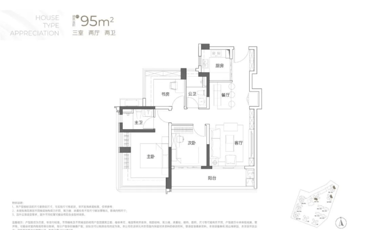 95㎡的3房2厅2卫:传统竖厅格局,客厅开间3.5米,LDKB一体化,S墙设计预留冰箱卡槽位,3个卧室分别做到了3.6米/2.8米/2.8米的宽度,主卧加1个次卧270°全景飘窗,客厅连接次卧出6.3米长的大阳台,U型厨房,得房率约95-97%(包含赠送),西南或东北朝向。户型分布在2栋2/3单元04/05户型,东北朝向看大南山、2栋1单元04/05户型西南朝向看小区;