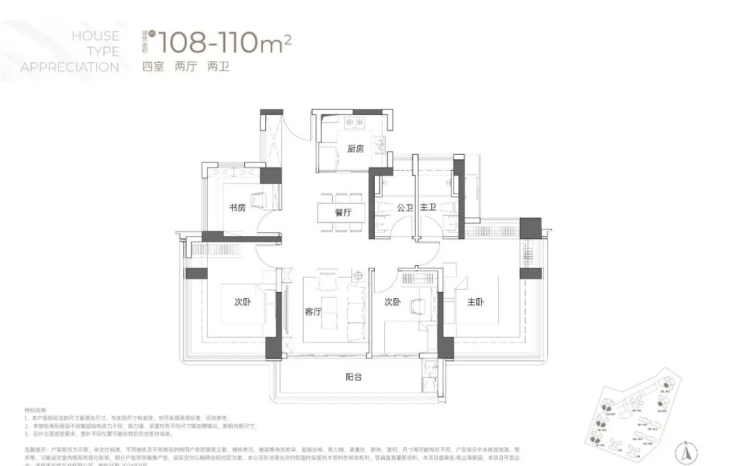 108-110㎡的4房2厅2卫:竖厅双龙抱珠格局,客厅开间3.5米,LDKB一体化,4个卧室分别做到了3.7米/3.4米/2.8米/2.6米的宽度,主卧加2个次卧270°全景飘窗,客厅连接次卧出6.1米长的大阳台,U型厨房,得房率约95-97%(包含赠送),西南或东南朝向。户型分布在1栋1/2/3单元03/04户型,03户型东南朝向,04户型西南朝向;只有2栋2/3单元看小区,其他都看向小区外部;