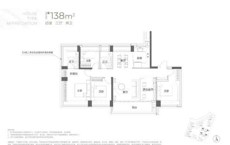138㎡的4房2厅2卫:竖厅南北通透格局,专梯入户,客厅6.1米开间,LDKB一体化,全屋飘窗,4个卧室分别做到了3.9米/3.25米/2.9米/2.8米的宽度,主卧加1个次卧270°全景飘窗,客厅出6.1米长的大阳台,U型厨房,得房率约95-97%(包含赠送),阳台主朝西南向。138平米户型分布在3栋1单元、3栋2单元、4栋1单元、4栋2单,4个单元纯大户型。