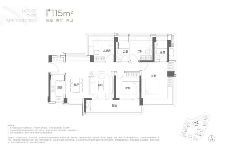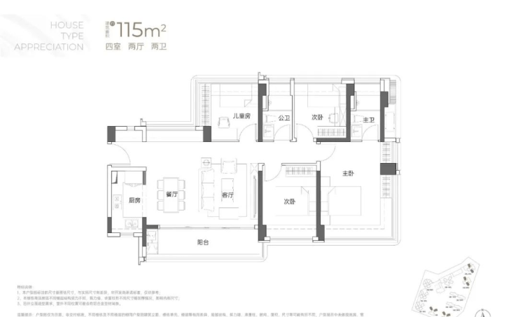 115㎡的4房2厅2卫:横厅南北通透格局,客餐厅6米开间,LDKB一体化,全屋飘窗,4个卧室分别做到了3.9米/3米/2.8米/2.6米的宽度,主卧加1个次卧270°全景飘窗,客厅出6米长的大阳台,L型厨房,得房率约95-97%(包含赠送),西南或东南朝向。115平米户型分布在1栋1单元、1栋2单元、1栋3单元01/02户型,01户型西南朝向都是看小区外围,02户型看向小区;