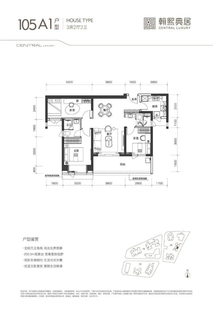 105㎡的3房2厅2卫,B户型(2栋3单元02/06户型),设计的是经典竖厅格局,客厅3.6米开间,LDKB一体化设计,三开间朝南,动静分区,3个卧室分别做到了主卧13.12㎡/次卧9.9㎡/次卧8.4㎡(包含墙体飘窗),客厅连接次卧出6.4米长的宽景大阳台,U型厨房,卫生间干湿分离,得房率约90%(包含赠送),正南或东南朝向。