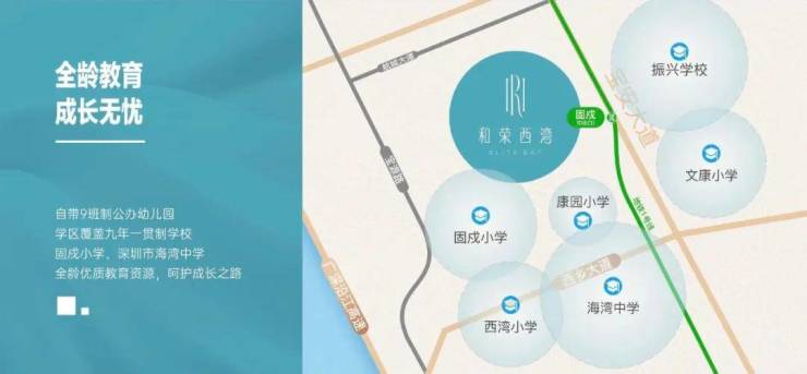 教育方面,项目自身规划了一所幼儿园,附近还有固戍小学和广东省一级学校海湾中学。(注:具体学区以教育局当年公布为准)