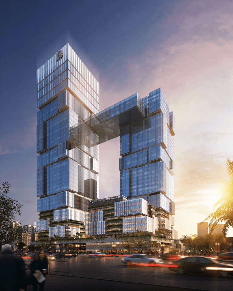 项目在高层延展出更多的户外空间;连接双塔的“空中连廊”构建了开放自由的社交场所。项目由3座塔楼组成,包含两座超高层双子塔写字楼及1座总部办公楼,打造相当于8个标准足球场大小的生态体育公园和2层商业配套。